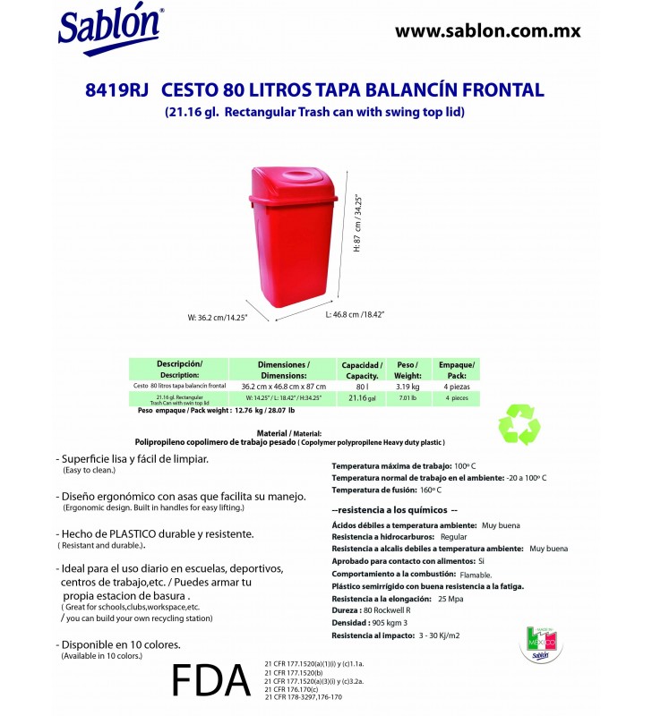 CESTO CON CAPACIDAD DE 80 LITROS / 21.16 GALONES CON BALANCÍN