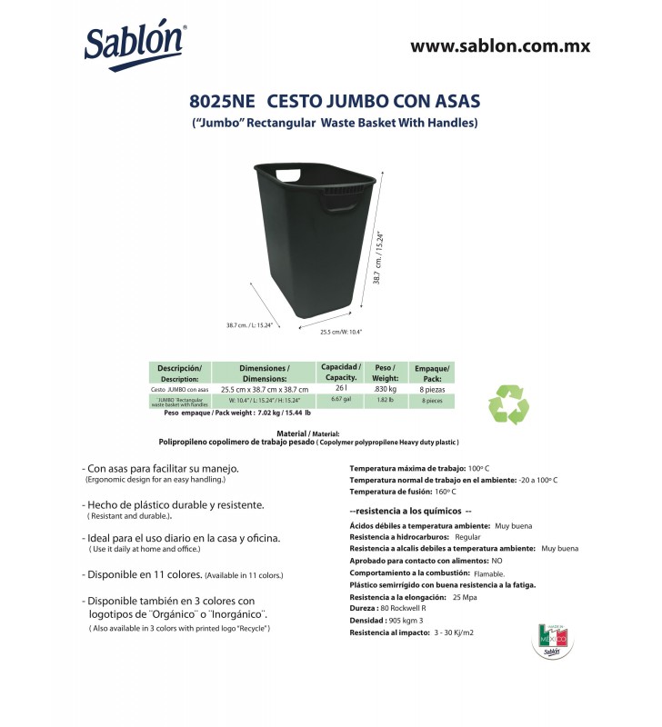 CESTO DE BASURA JUMBO RECTANGULAR, CON ASAS.CAPACIDAD 26 L / 6.87 GAL.