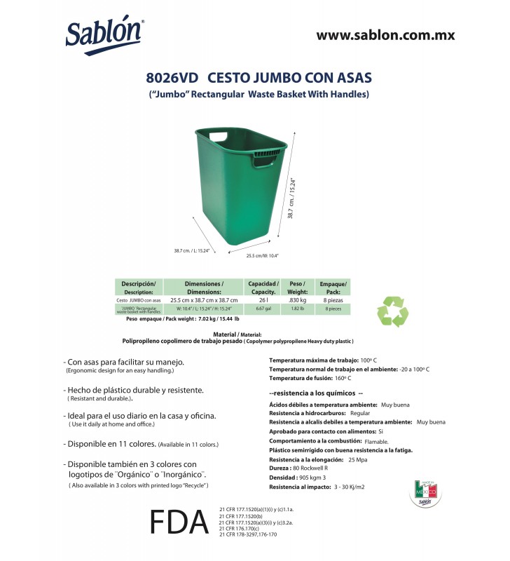 CESTO DE BASURA JUMBO RECTANGULAR, CON ASAS.CAPACIDAD 26 L / 6.87 GAL.