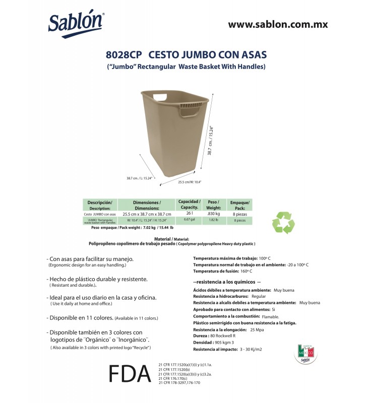 CESTO DE BASURA JUMBO RECTANGULAR, CON ASAS.CAPACIDAD 26 L / 6.87 GAL.