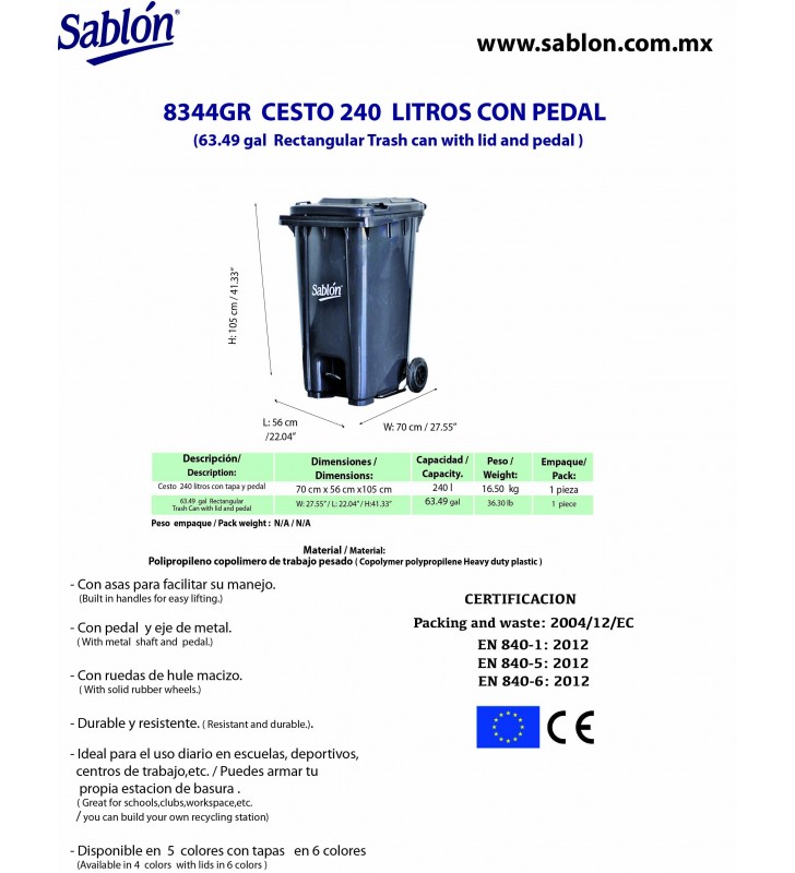CESTO DE 240 LITROS / 63.49 GL, CON ASAS EN LA TAPA , PEDAL Y RUEDAS QUE FACILITAN SU DESPLAZAMIENTO