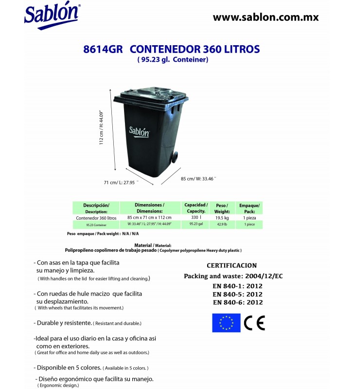 CONTENEDOR DE ALTA RESISTENCIA CON TAPA, AGARRADERAS Y RUEDAS. CAP. 360 LTS./ 95.23 GALONES APROX.